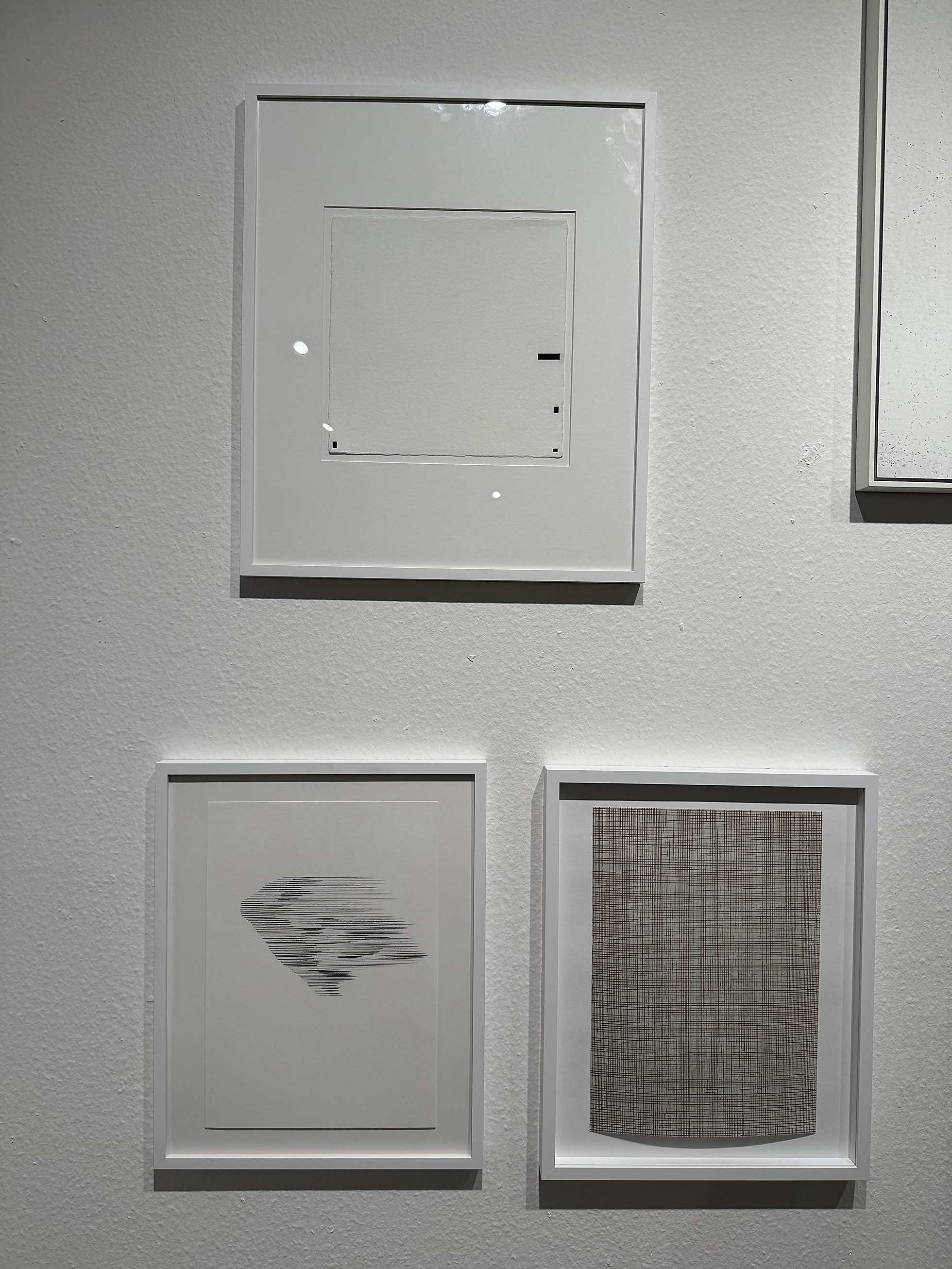 Vielleicht lassen sich, um einen ersten Überblick zu gewinnen, vier unterschiedliche Herangehensweisen aus den künstlerischen Positionen herausfiltern. Am Anfang künstlerischer Prozesse steht häufig das leere, weiße Blatt Papier oder die grundierte Leinwand. Hier treffen wir zuerst auf minimierte, enthaltsame Eingriffe und „Randerscheinungen“, die viel von dieser Grundfläche unberührt belassen oder nur minimal strukturieren. In Werken von Dronkers, Kobayashi, Taubert, Uhde, Wesenberg und mit anderen Mitteln bei Schweppe korreliert die solitäre Formsetzung mit der „beruhigten“ Leere.