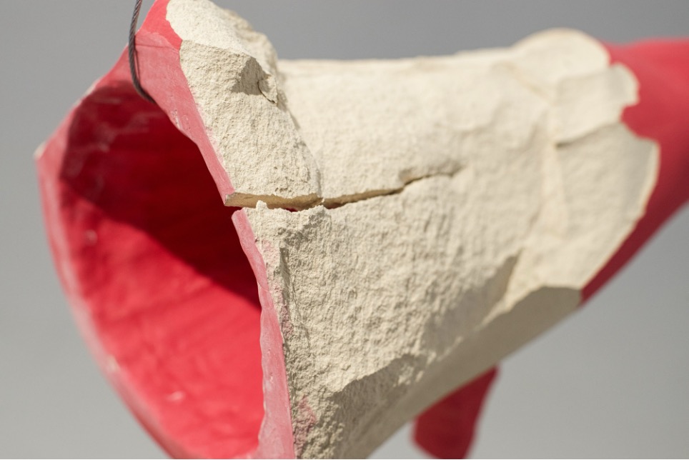 Arbeiten: Prendre la parole (Übungen), 1 von 4 Keramik-Megaphonen teilweise gesprengtesSteinzeug, engobiert, hochgebrannt, Länge je ca. 34 cm