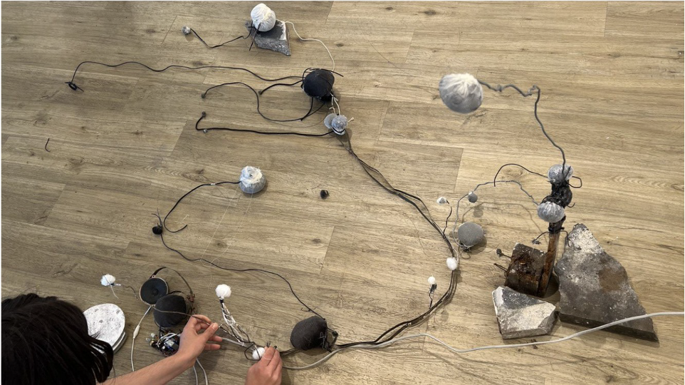 Work: Trembling limbs, Sound sculpture Found material, Walkman, Speaker, Stones. The sound installation deals with social relationships in and with our environment. It depicts interpersonal connection in forms that make liveliness and hope visible.